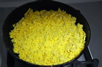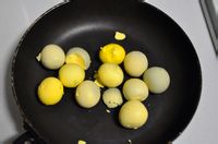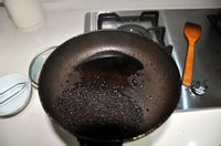 3)以中火干煎,連續(xù)翻炒使蛋黃均勻受熱。大約15分鐘后,蛋黃會有點燒焦,20分鐘時開始起濃煙,這時開始只要翻攪幾下即可,30分鐘左右,濃煙達(dá)到最大,蛋黃會變成黑色,看起來像瀝青,此時用鍋鏟壓,會流出蛋黃油。