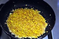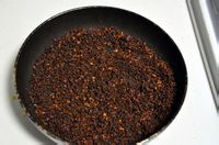 2)放入平底鍋內(nèi),不需要加油,以木質(zhì)或竹制鍋鏟壓碎,越細(xì)越好,小火慢慢翻炒。